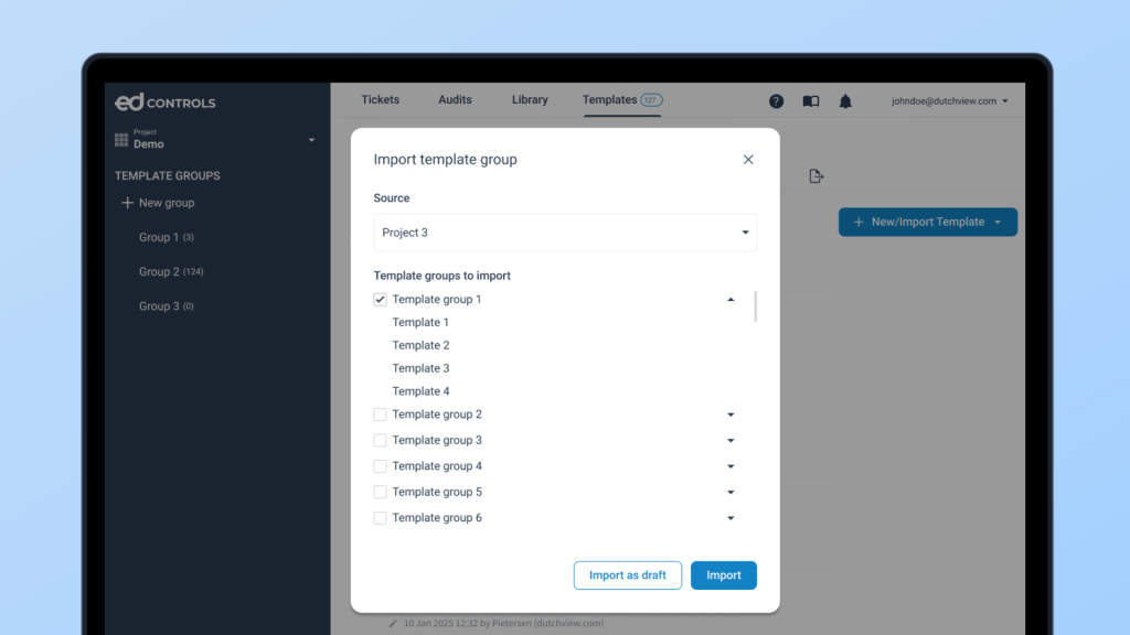 If you choose 'Import template group', you simply select a project via a dropdown. Then you automatically see which groups belong to it, neatly grouped and clearly displayed in a scrollable window. You can select multiple groups at once and import them with a single click.